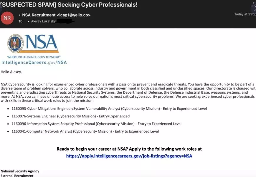 I criminali informatici da profitto le inventano tutte e su un canale Telegram di OSINT (Open Source Intelligence), ecco che spunta oggi un thread nel quale si parla di una nuova campagna di phishing ai danni della National Security Agency (NSA) degli Stati uniti D’America, molto ben fatta, come riportato nel Tweet in calce dove viene riportato in lingua russa “il momento in cui ti viene offerto un lavoro da chi non te lo aspettavi 🙂 In generale, bello :-)”