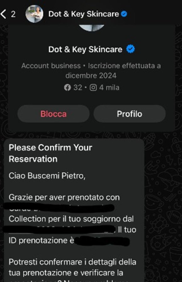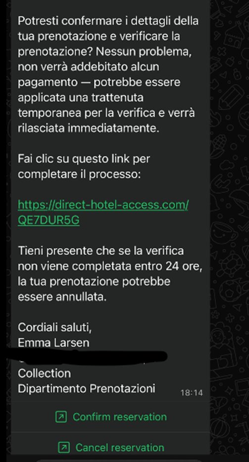 Si tratta di un caso reale accaduto recentemente. Tutti i dati sensibili sono stati opportunamente oscurati; tuttavia, gli ID di prenotazione e le date di pernottamento presenti erano reali, a dimostrazione della concretezza e dell’elevato livello di inganno dell’attacco.