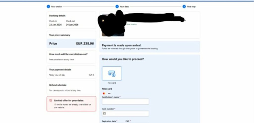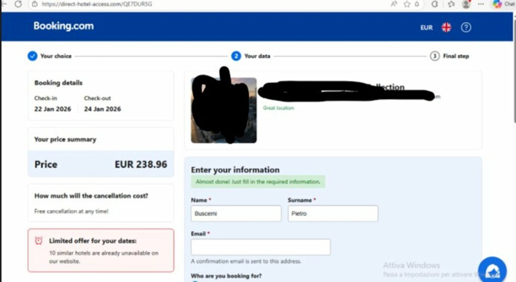 La presenza di un forte senso di urgenza, legato alla presunta perdita della prenotazione, rappresenta un ulteriore fattore di pressione psicologica che induce l’utente ad agire rapidamente, senza effettuare le necessarie verifiche. Il reindirizzamento verso una falsa pagina di Booking, nella quale compaiono anche il nome e il cognome reali della vittima, rafforza ulteriormente la percezione di legittimità dell’operazione.