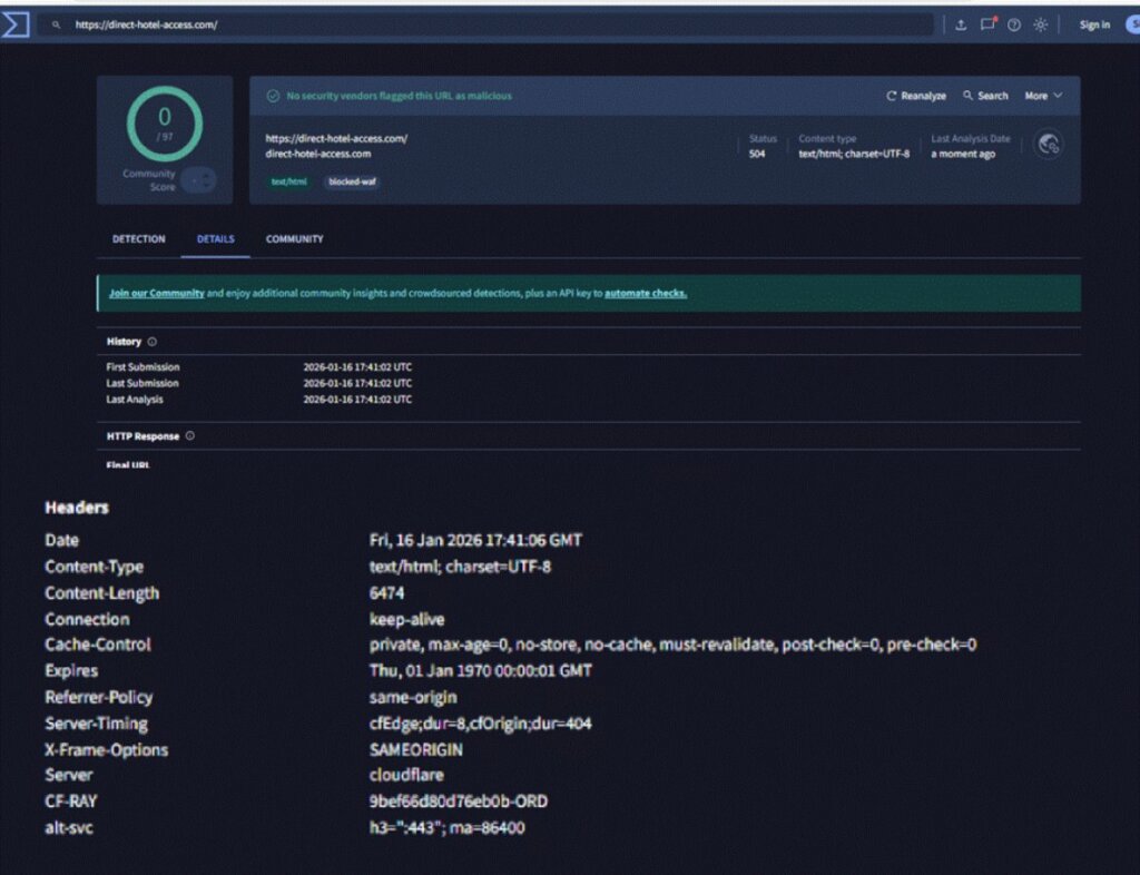 Link Malevolo: hxxps://direct-hotel-access[.]com/[QE7DUR5G] Considerazioni finali