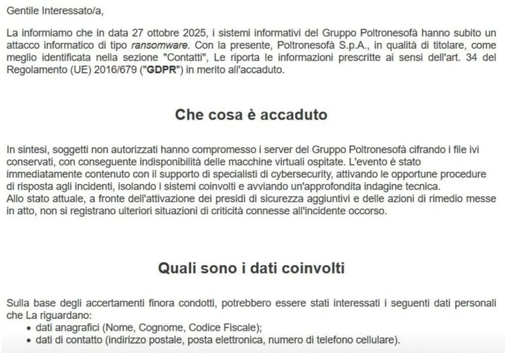 Il 27 ottobre 2025, il Gruppo Poltronesofà è finito nel mirino di un attacco informatico di tipo ransomware che ha messo fuori uso alcuni sistemi aziendali e reso indisponibili diverse macchine virtuali. L’azienda, in qualità di titolare del trattamento, ha notificato l’incidente agli interessati come previsto dall’art. 34 del Regolamento UE 2016/679 (GDPR).