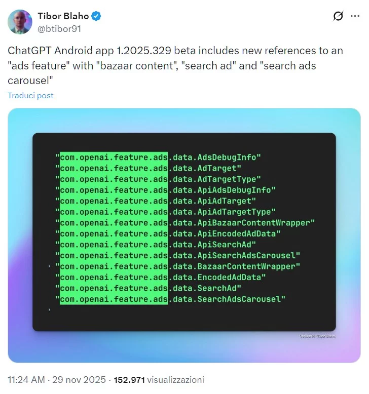 Come segnalato dall’utente X (ex Twitter ) con lo pseudonimo Tibor , nella versione beta dell’app Android ChatGPT (1.2025.329) sono comparsi riferimenti a una nuova funzionalità pubblicitaria. Il codice conteneva frasi come “funzione pubblicitaria”, “contenuto bazaar”, nonché “annuncio di ricerca” e “carousel di annunci di ricerca”.