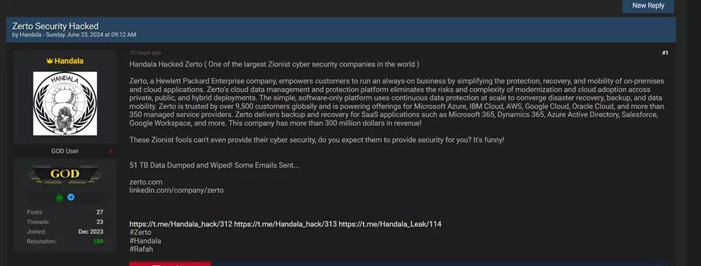 Recentemente, Handala, un attore malevolo ha pubblicato un post su un noto forum del dark web, rivendicando un attacco informatico ai danni di Zerto, una sussidiaria di Hewlett Packard Enterprise (HPE). Zerto è rinomata per le sue soluzioni avanzate di disaster recovery, resilienza ai ransomware e mobilità dei carichi di lavoro, progettate specificamente per infrastrutture virtualizzate e ambienti cloud.