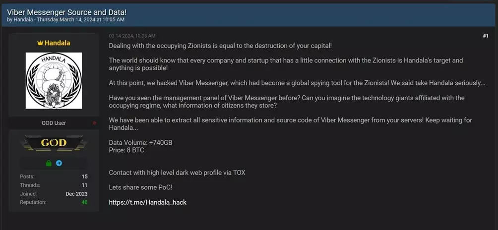 Recentemente, Handala ha rivendicato un attacco contro l’app di messaggistica Viber, dichiarando di aver sottratto 740 GB di dati, inclusi il codice sorgente e altre informazioni sensibili. Questo gruppo ha anche richiesto un riscatto di 8 Bitcoin, equivalente a circa 583.000 dollari, per il rilascio dei dati rubati.