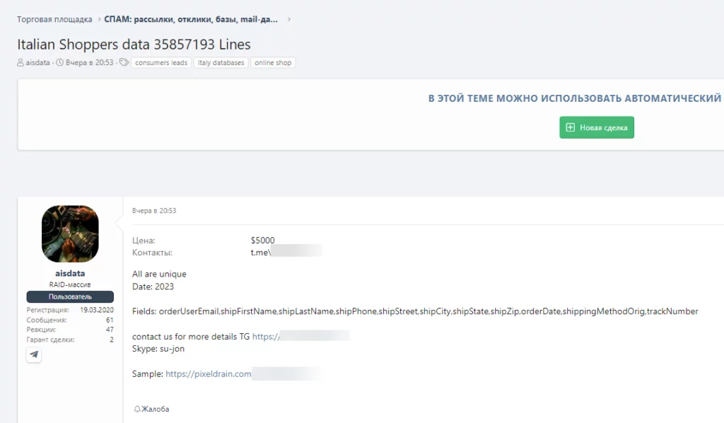 Recentemente, un attore di minacce in un forum clandestino in lingua russa ha pubblicato una presunta violazione dei dati che coinvolge un’organizzazione italiana. Secondo quanto riportato dal criminale informatico, sarebbero stati esposti milioni di record contenenti informazioni sensibili. Tuttavia, poiché queste informazioni provengono da una fonte non verificata e legata ad attività criminali, è essenziale trattarle con cautela.