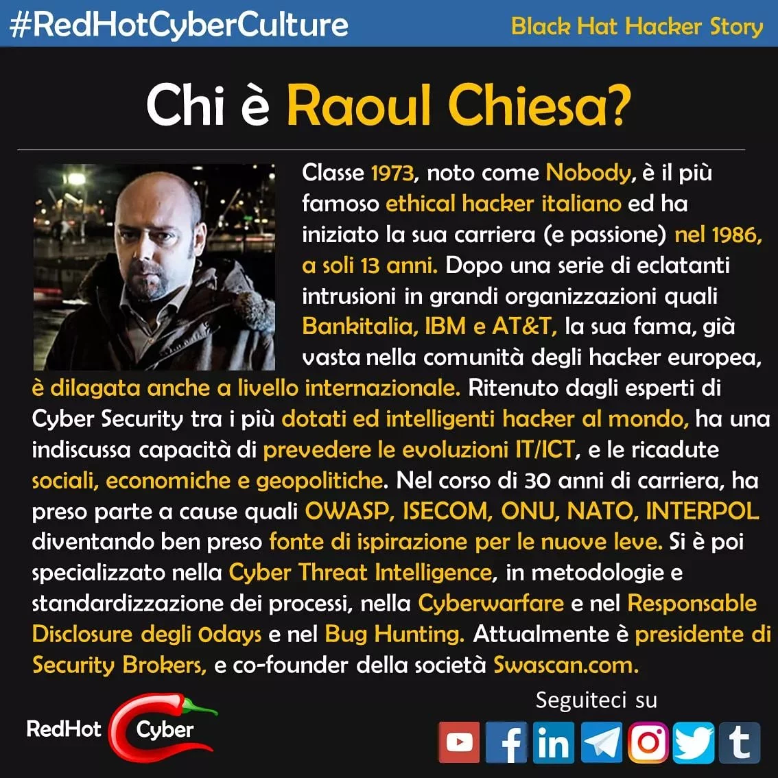 Anche in italia l’arte dell’hacking ha avuto esponenti di spicco, oggi vi presentiamo per la serie Black Hat Hacker, Raoul Chiesa, “Conosciuto” come #Nobody.