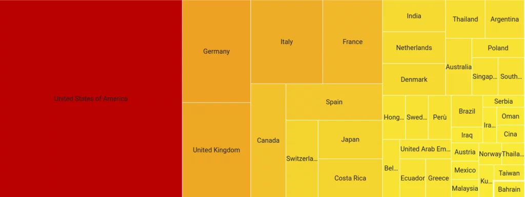 Il bilancio degli attacchi a doppia estorsione di Aprile 2022 ha coinvolto 40 nazioni. Il numero degli stati impattati è leggermente inferiore rispetto al mese di Marzo. Tuttavia, se raffrontato all’incremento degli attacchi, il dato indica una più concentrata attività ai danni dei paesi coinvolti. Qui, l’Italia si posiziona sempre tra le prime: terza questo mese escludendo dal conteggio gli Stati Uniti, che rimangono comunque al di sopra di ogni classifica.