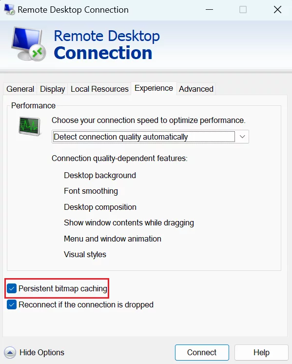 La memorizzazione nella cache persistente dei bitmap è abilitata per impostazione predefinita in mstsc.exe (credit insinuator)