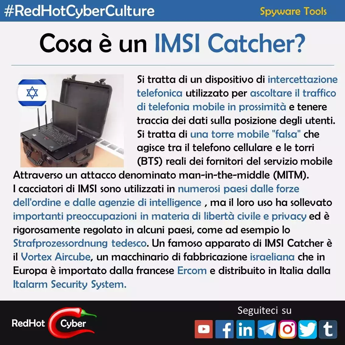 Gli IMSI Catcher sono degli strumenti che sfruttano delle vulnerabilità dei protocolli radio (ad es. SS7 su LTE) consentendo alle intelligence e alle polizie di molti stati di svolgere delle intercettazioni telefoniche in prossimità della stazione radio base.