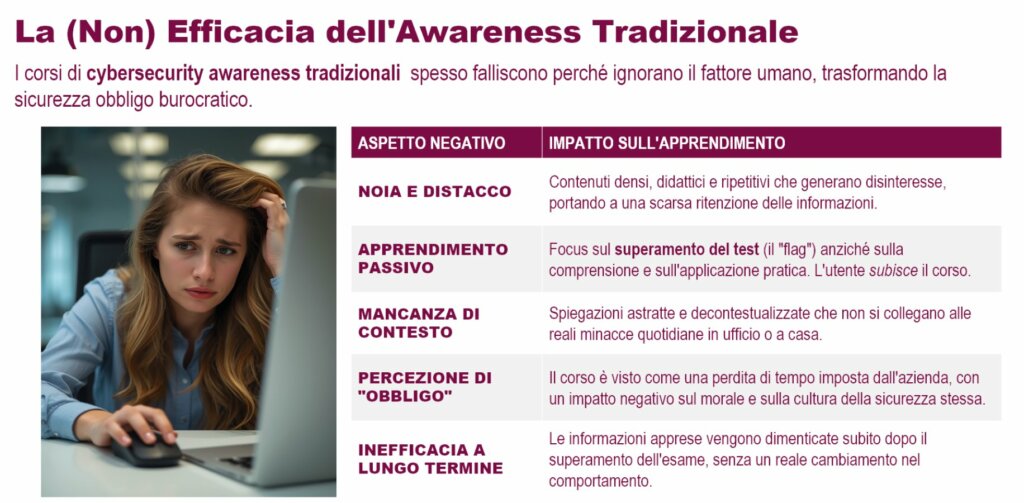 I personaggi e le situazioni sono progettati per far comprendere immediatamente quali comportamenti siano rischiosi e quali invece proteggano l’azienda, evitando il classico senso di noia che accompagna i corsi tradizionali.