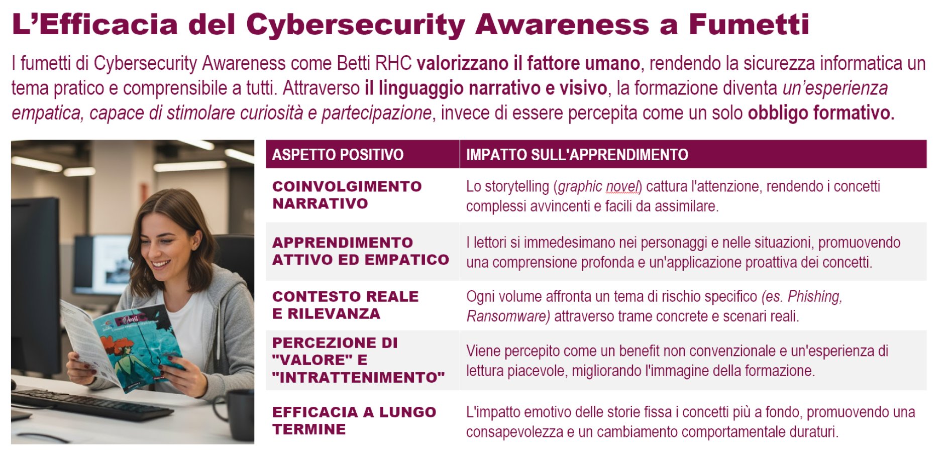 Le storie di Betti RHC sono adatte a tutti i livelli di competenza, dai neofiti ai più esperti, e permettono di apprendere concetti complessi della cybersecurity senza sacrificare il divertimento. La formazione diventa così un’esperienza condivisa che rafforza anche il senso di squadra e collaborazione all’interno dell’azienda.