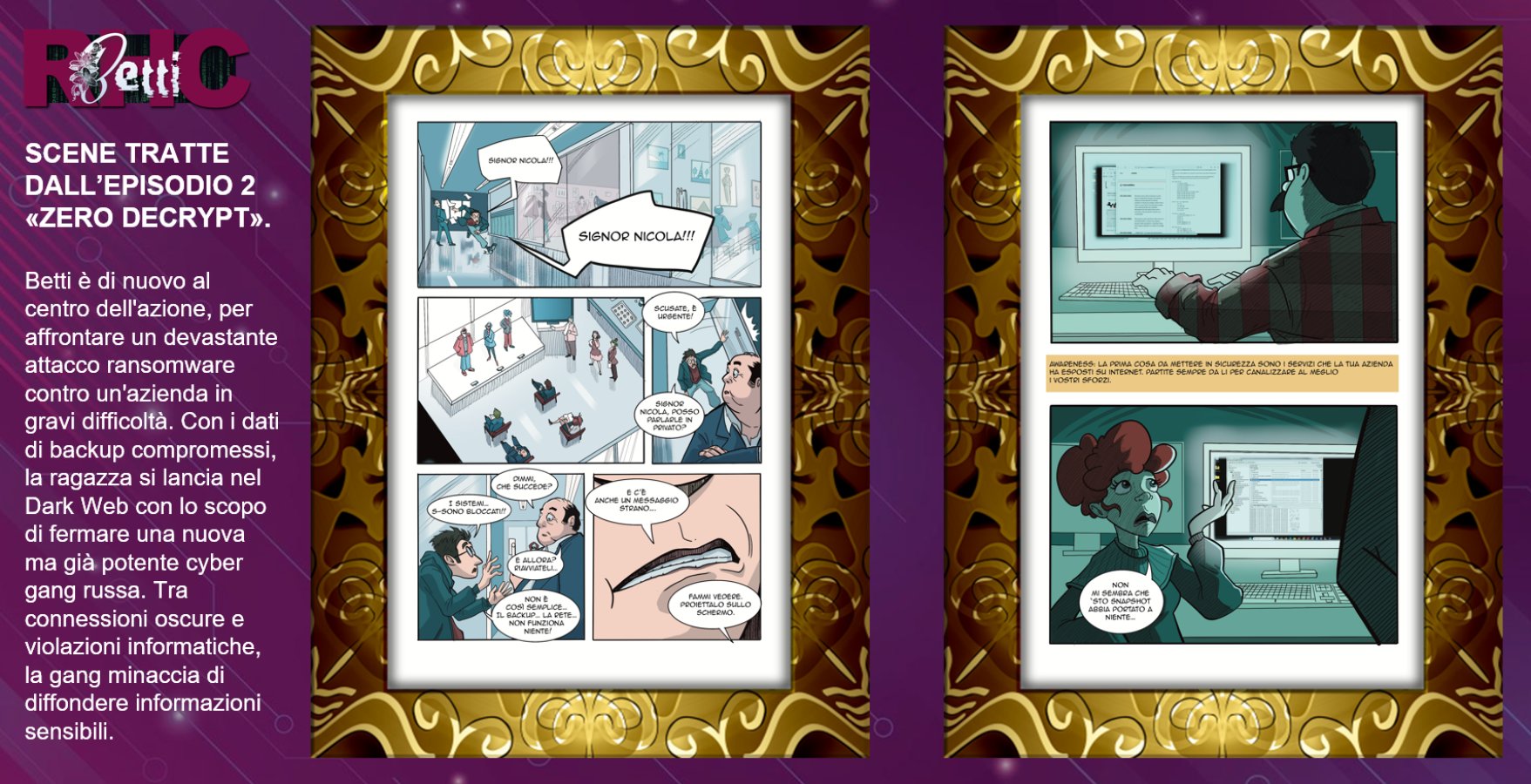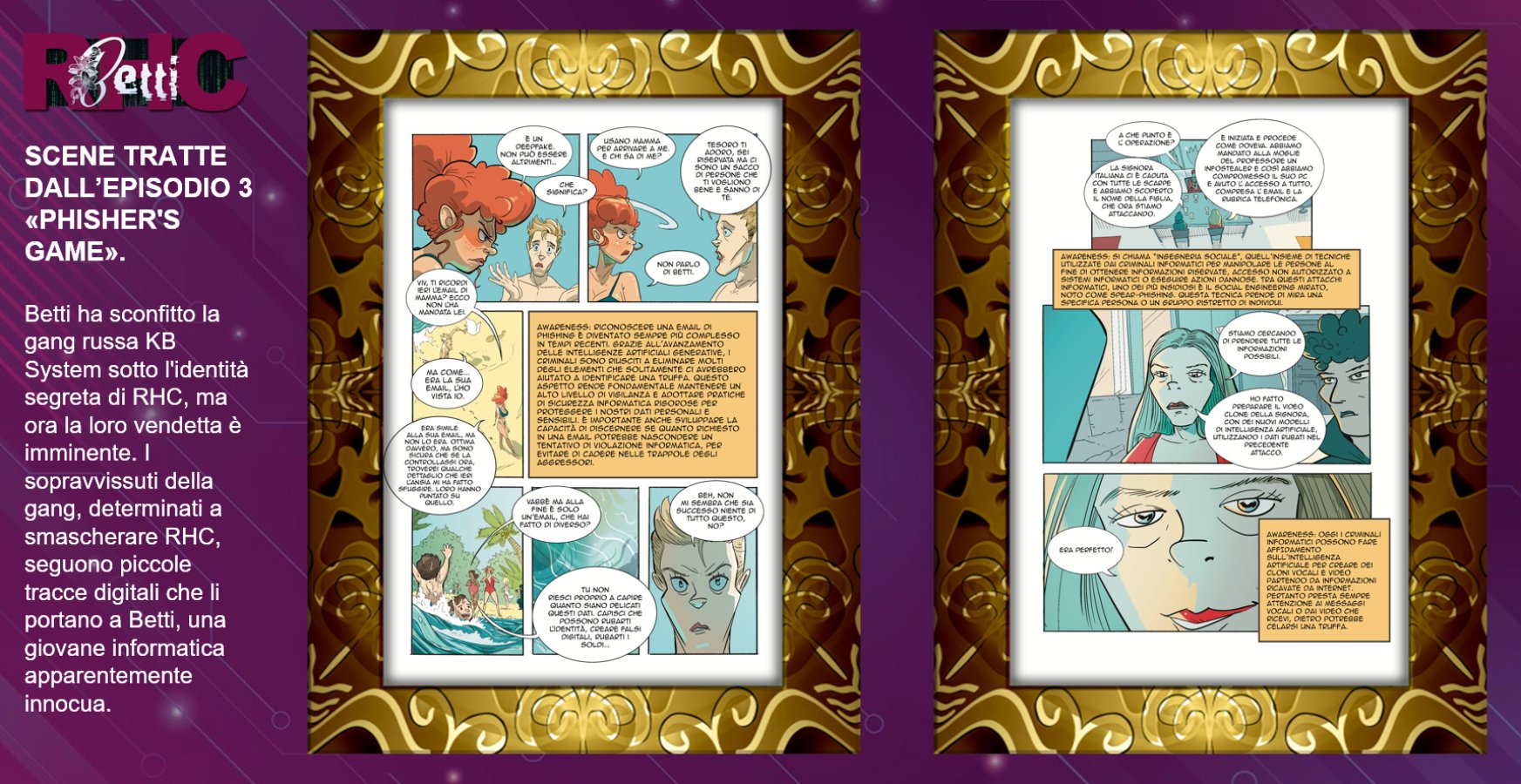 Betti RHC è una serie a fumetti (graphic novel) pensata per sensibilizzare i dipendenti sui rischi digitali attraverso storie avvincenti e personaggi realistici. Ogni episodio affronta tematiche specifiche come phishing, ransomware, password deboli e cyberbullismo, offrendo lezioni pratiche su come riconoscere e prevenire le minacce informatiche. Attualmente la serie conta 4 episodi già realizzati e ulteriori 3 in realizzazioni entro la fine del 2026.