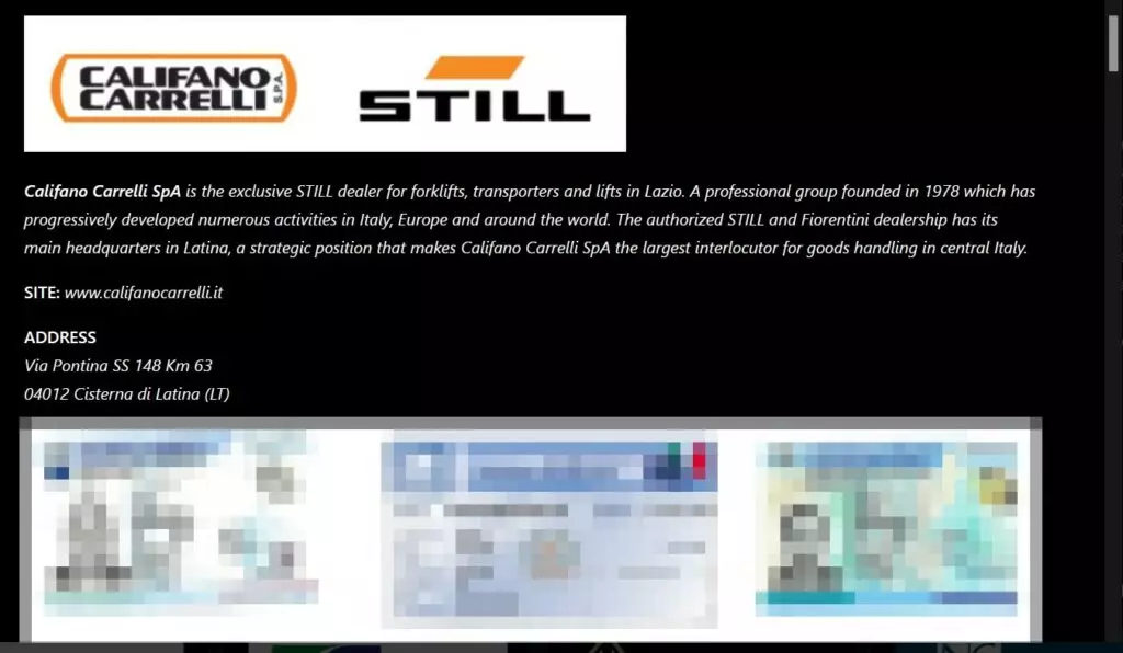 Califano Carrelli SpA è rivenditore esclusivo di carrelli elevatori, trasportatori e ascensori nel Lazio. Un gruppo professionale fondato nel 1978 che ha progressivamente sviluppato numerose attività in Italia, Europa e nel mondo. La concessionaria autorizzata STILL e Fiorentini ha la sua sede principale a Latina, posizione strategica che fa di Califano Carrelli SpA il più grande interlocutore per la movimentazione merci nel centro Italia.