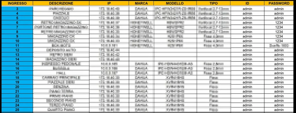Samples pubblico, riportato dalla cybergang dove vengono mostrate le password di accesso ad alcuni device con password di default.