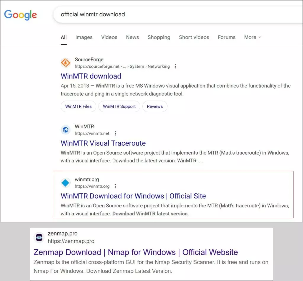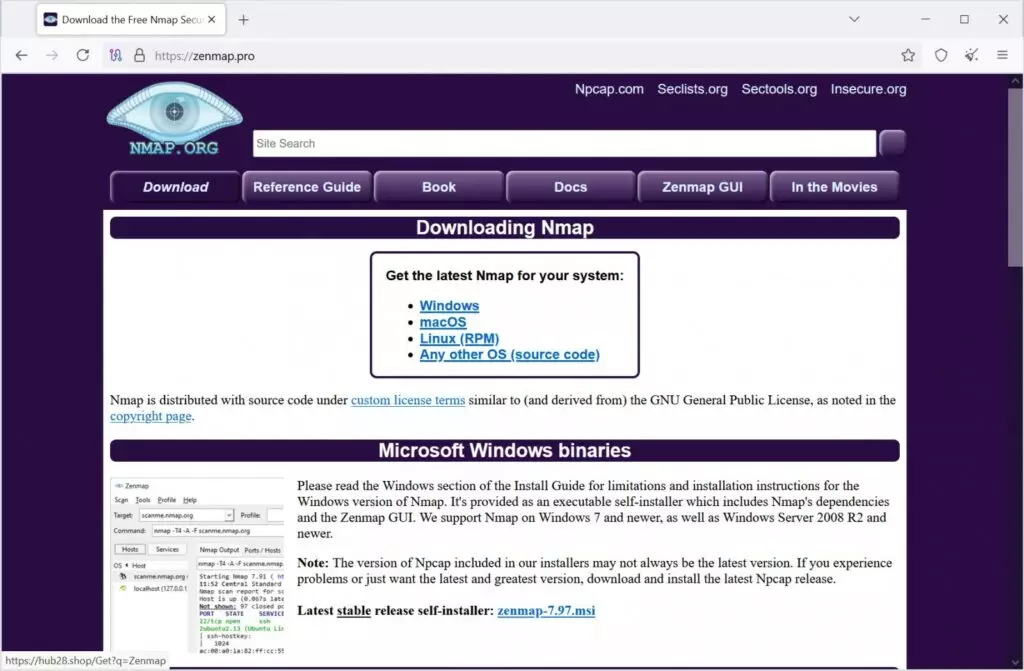 Se l’utente viene reindirizzato a zenmap[.]pro dai risultati di ricerca, vede un clone del sito legittimo dell’utilità nmap (Network Mapper).