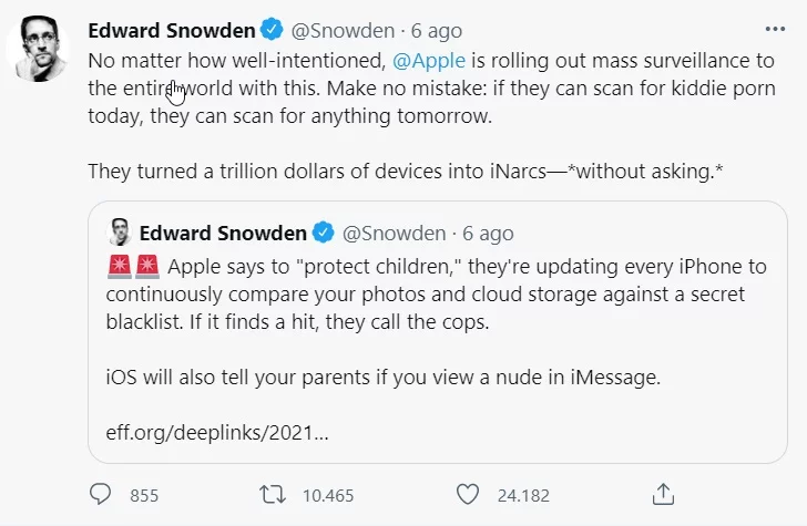 “Non importa quanto bene sia intenzionata, @Apple sta estendendo la sorveglianza di massa al mondo intero con questo. Non commettere errori: se possono cercare porno per bambini oggi, possono cercare qualsiasi cosa domani. Hanno trasformato un trilione di dollari di dispositivi in iNarcs—*senza chiedere.*”