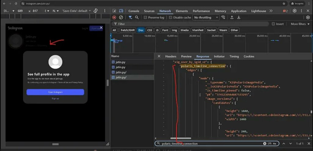 Analizzando il traffico dati, ha individuato la causa in una vulnerabilità del backend: inviando una semplice richiesta GET non autenticata a un profilo privato, il server restituiva un file HTML contenente un oggetto JSON chiamato polaris_timeline_connection.
