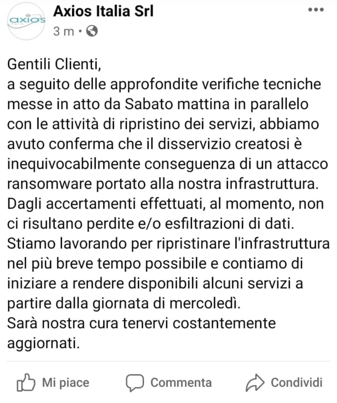 L’azienda ha riportato sul suo sito che “a seguito delle approfondite verifiche tecniche messe in atto da Sabato mattina in parallelo con le attività di ripristino dei servizi, abbiamo avuto conferma che il disservizio creatosi è inequivocabilmente conseguenza di un attacco ransomware portato alla nostra infrastruttura.