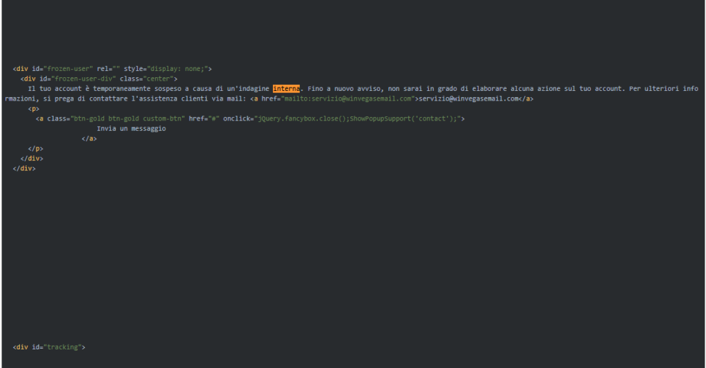 È presente, ad esempio, un blocco HTML nascosto (display: none) che mostra un messaggio di sospensione account: