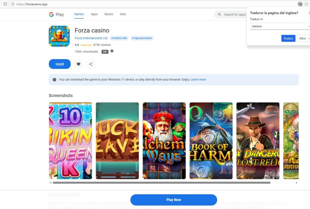 La pagina si presenta come store Android ma nel testo invita a scaricare il gioco su “Windows 11 device” -un’incoerenza che suggerisce assemblaggio da template differenti. Una piattaforma reale mantiene coerenza tra lingua, mercato e dati strutturati. Qui si osserva una frammentazione tipica di asset generici, riutilizzabili e clonabili su domini differenti.