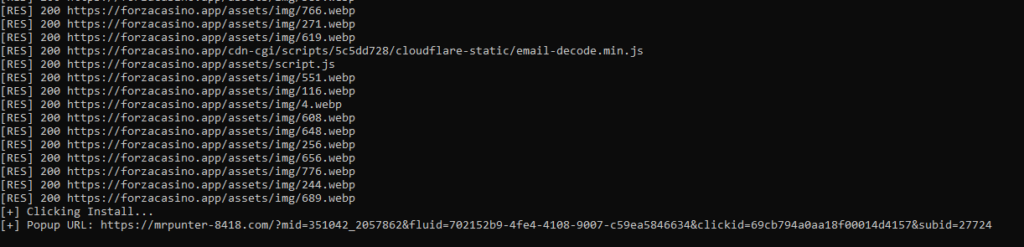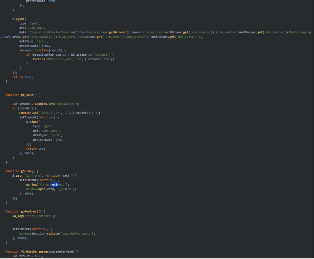 Il codice JavaScript conferma questa dinamica. Ogni interazione viene intercettata e trasformata in evento tracciato. Quando l’utente clicca su “Install”, non accade ciò che l’interfaccia promette: viene invece inviata una richiesta verso un endpoint interno (/ua2.php) che raccoglie informazioni sul dispositivo, sul browser e sui parametri di marketing presenti nell’URL.