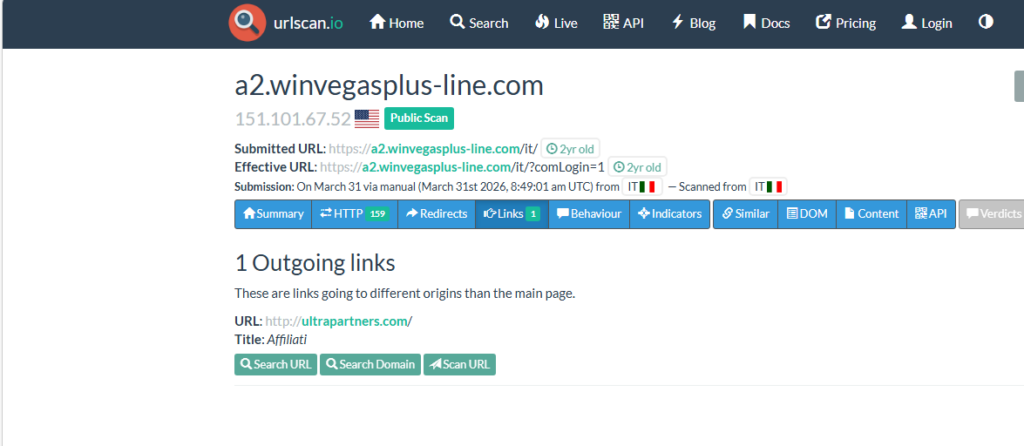 L’analisi tramite piattaforme di scanning pubbliche conferma inoltre un collegamento esplicito tra la piattaforma finale e il network di affiliazione. La pagina https://a2.winvegasplus-line.com/it/ presenta infatti un link in uscita diretto verso: