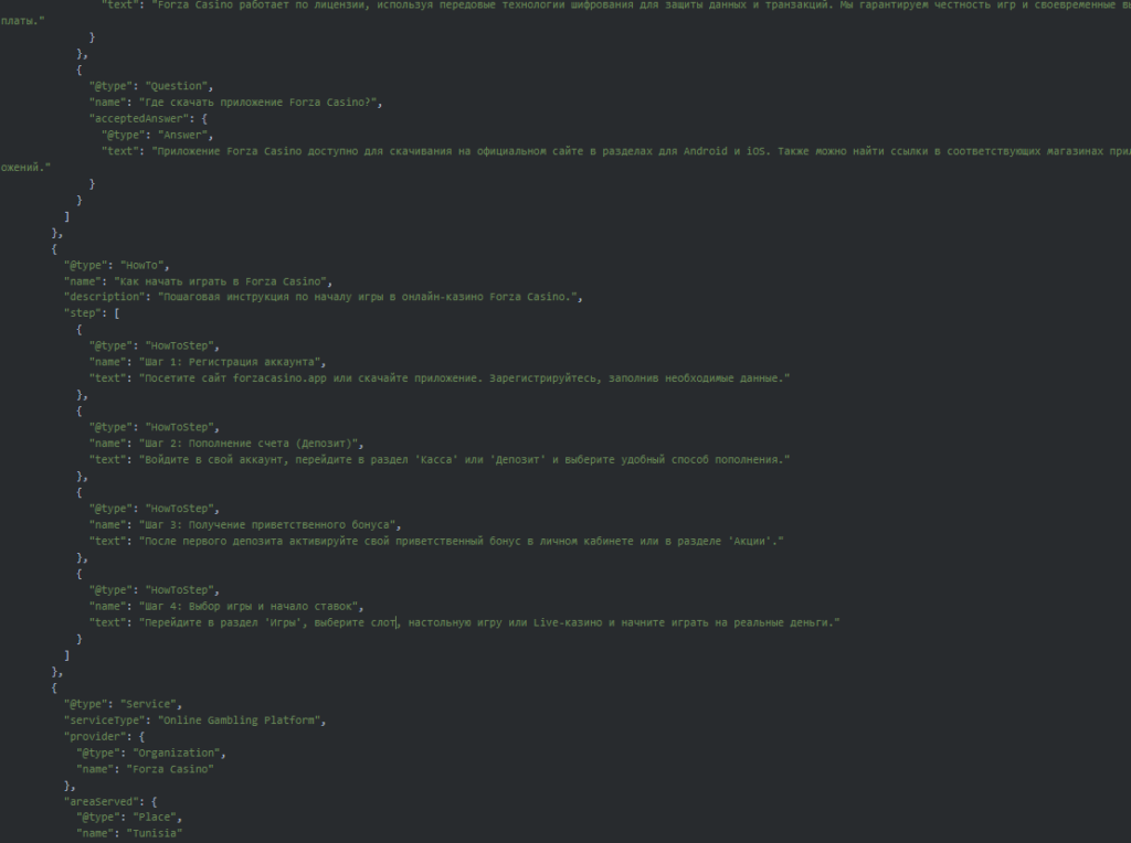 Nel markup compaiono riferimenti linguistici e geografici incompatibili: inLanguage: "ru-RU", contenuti in lingua russa (inclusi step operativi descritti in cirillico all’interno dei dati strutturati), areaServed riconducibile alla Tunisia, contenuti visuali in inglese e tracce lessicali compatibili con ambienti turcofoni.