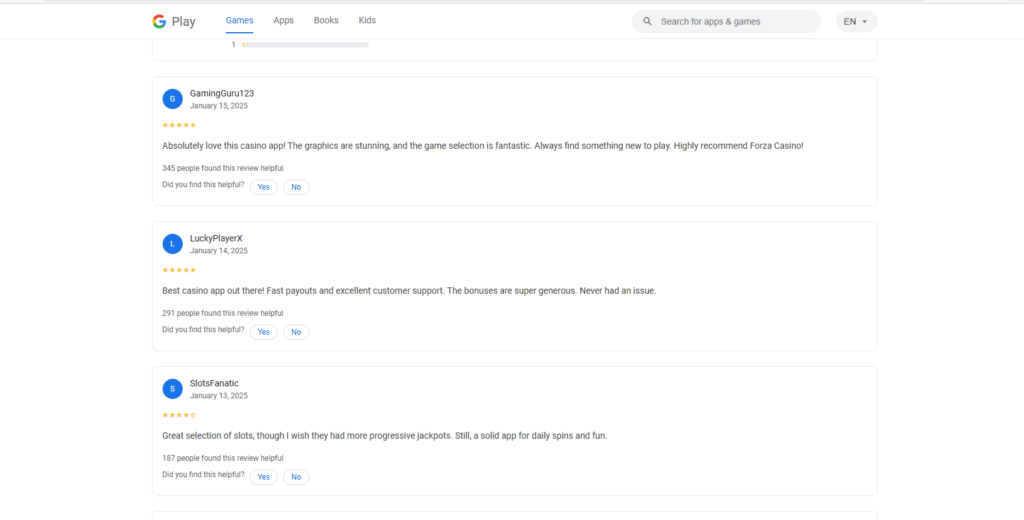 Lo sviluppatore dichiarato – Forza Entertainment Ltd., con indirizzo “123 Casino Blvd, Gamestown, GZ 10001” – non presenta riscontri verificabili. Le recensioni sono generate tramite JSON-LD, tutte concentrate in un arco temporale ristretto e attribuite a profili con username generici (“GamingGuru123”, “BonusHunter”, “CardShark77”), con un pattern di distribuzione e linguaggio tipico dei contenuti generati automaticamente.