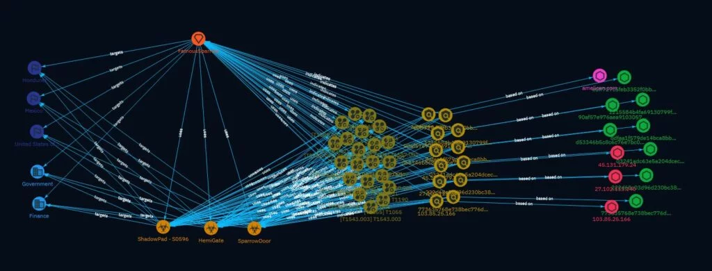 Questi aspetti sono ben rappresentati nella mappa relazionale elaborata dai ricercatori, dove FamousSparrow è posto al centro di un ecosistema che collega paesi colpiti (tra cui Stati Uniti, Messico e Honduras), settori strategici (governo e finanza), e una triade di strumenti offensivi: SparrowDoor, HemiGate e ShadowPad. Quest’ultimo è stato utilizzato dal gruppo per la prima volta, segnando un’evoluzione nella loro dotazione tecnica. ShadowPad, noto per essere un backdoor modulare ad alto potenziale, è già stato impiegato da altri gruppi APT cinesi come APT41, Winnti e Earth Lusca. Il suo impiego da parte di FamousSparrow rafforza l’ipotesi di convergenza tattica e tecnica tra più gruppi APT allineati alla Cina, e viene evidenziato nel grafo attraverso l’interconnessione di numerosi indicatori di compromissione condivisi, IP malevoli e tecniche MITRE ATT&CK.