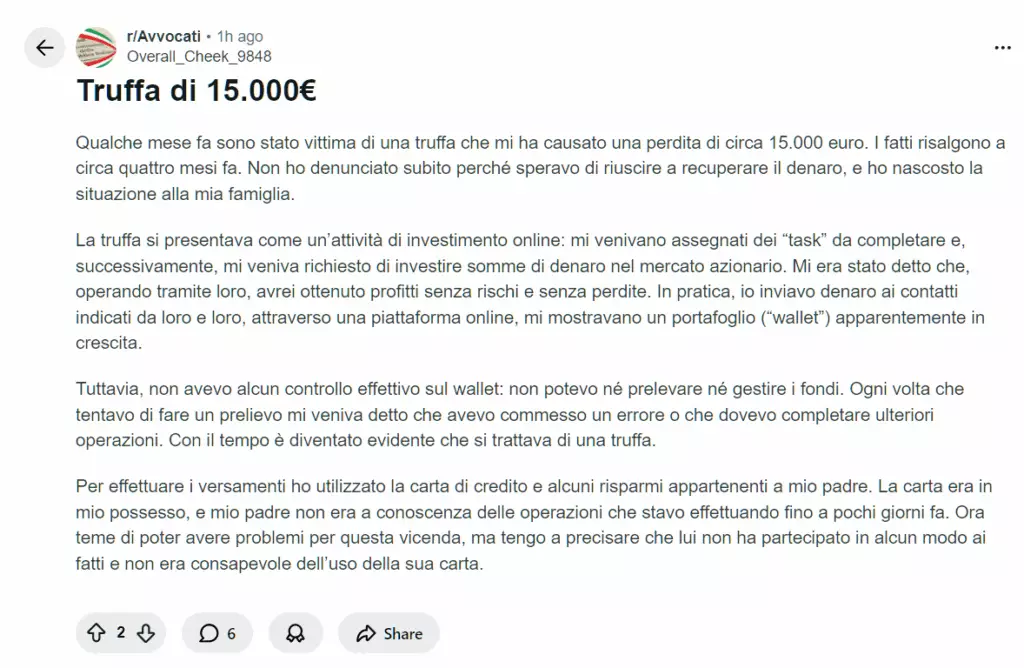Non tanto per il denaro perso, ma per la vergogna. Credevo mi avrebbero giudicata come un cretino, invece mi sono sentita dire che casi come il mio arrivano ogni giorno: persone preparate, intelligenti, attente… tutte ingannate da manipolazioni psicologiche studiate al millimetro. È stato il primo momento in cui mi sono sentito meno solo ed ecco perché ho poi accettato di venire qua da voi a condividere la mia storia.