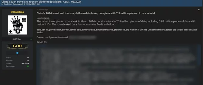 Nella mattina del 6 luglio 2024, un utente noto come “BlackKing” ha rivelato su un forum di hacking una significativa violazione dei dati riguardante una piattaforma di viaggi e turismo cinese. Questa fuga di informazioni, avvenuta nel marzo 2024, ha portato all’esposizione di 7,5 milioni di record, di cui 5,82 milioni contengono identificativi di residenti.