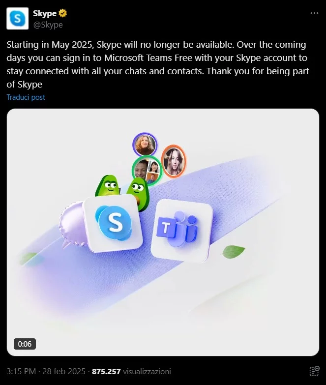 Nel mondo della tecnologia, pochi nomi evocano tanta nostalgia quanto Skype. Eppure, dopo due decenni di onorato servizio, Microsoft ha deciso di spegnere per sempre la piattaforma che ha rivoluzionato la comunicazione digitale nei primi anni 2000. A partire da maggio, Skype “non sarà più disponibile”, ha confermato l’azienda su X, invitando gli utenti a migrare su Microsoft Teams, il suo servizio di comunicazione in continua espansione.