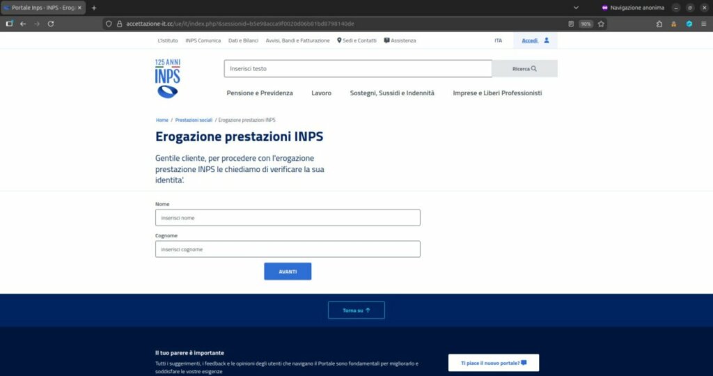 Una volta aperta la pagina, agli utenti viene richiesto di inserire informazioni anagrafiche e finanziarie, compreso l’IBAN. La procedura prosegue con una richiesta particolarmente invasiva: il caricamento di immagini di documenti personali e materiale identificativo.