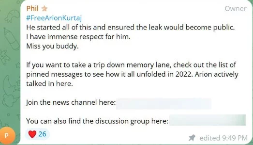 Il proprietario del canale Telegram ha quindi reso omaggio all’hacker di Lapsus$ Arion Kurtaj. Nel post sul canale Telegram è stato riportato dall’hacker quanto segue: