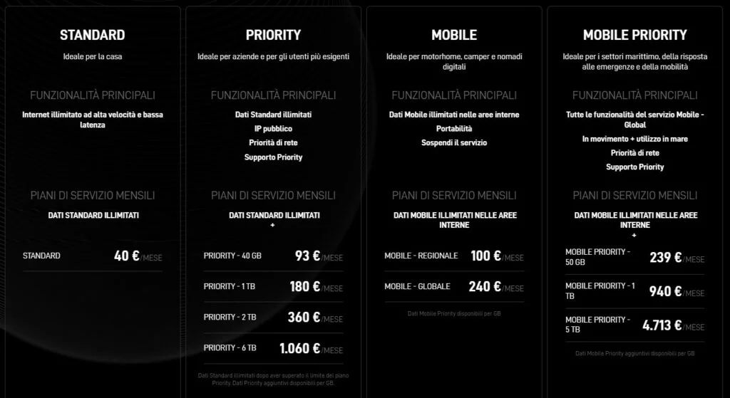 L’IP pubblico, priorità di rete, sospensione del servizio, portabilità, utilizzo in movimento ed in mare aperto, restano servizi in esclusiva degli altri piani PRIORITY, MOBILITY, MOBILITY PRIORITY, che vanno dai 93 ai 4713€.