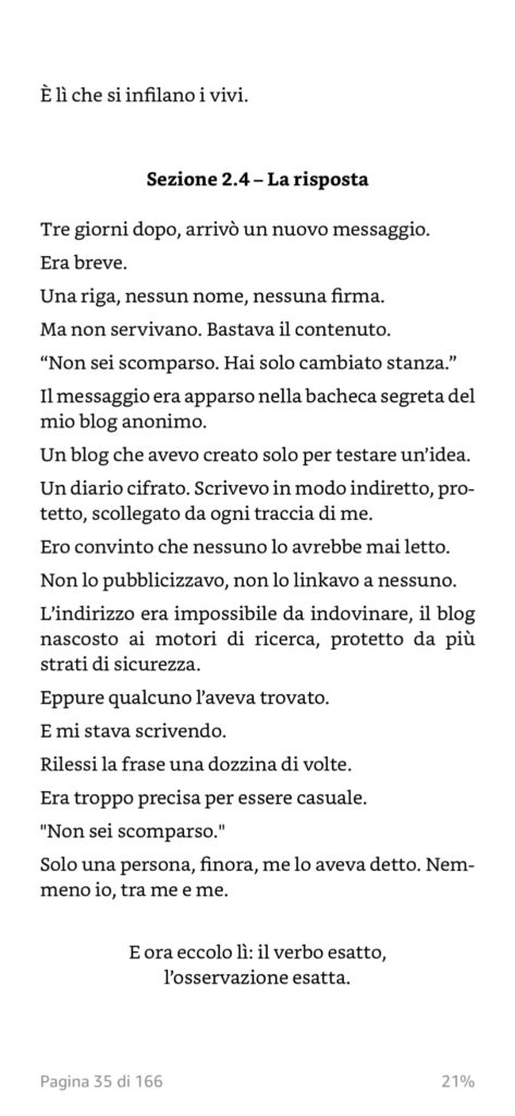 Il libro si muove tra thriller psicologico, riflessione tecnologica e dimensione filosofica, mantenendo però un centro profondamente umano. È anche, in modo intimo e laterale, una storia d’amore: forse la più difficile da raccontare quando l’identità non appartiene più solo alle persone, ma ai sistemi che le osservano.