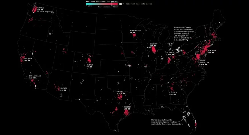 Secondo un’analisi di Bloomberg , oltre il 75% dei casi di disturbi significativi della qualità dell’energia si sono verificati entro un raggio di 50 miglia da grandi data center.