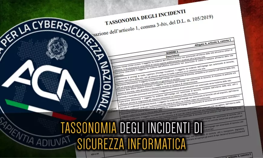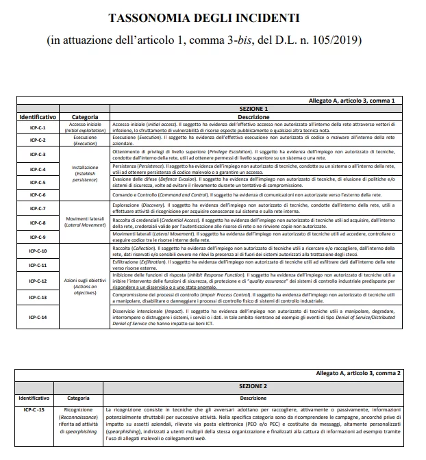 Nell’allegato A della Tassonomia degli incidenti che debbono essere oggetto di notifica (D.L.n. 105/2019) del 10/01/2023 si pone in essere una classificazione degli incidenti informatici (titolo dell’allegato “Tassonomia degli incidenti – in attuazione dell’articolo 1, comma 3-bis del D.L. 105/2019”) del tutto simile alla classificazione Mitre Att&ck della catena di attacco in tutte le sue fasi.