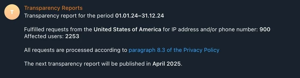 I ricercatori hanno notato che nel periodo da ottobre a dicembre 2024, Telegram ha iniziato a fornire più spesso dati sugli utenti alle forze dell’ordine. Così, da gennaio a settembre 2024, Telegram ha accolto 14 richieste delle autorità americane relative alla divulgazione di indirizzi IP e numeri di telefono, che hanno interessato un totale di 108 utenti. Ma in tutto il 2024 le richieste di questo tipo sono state 900, per un totale di 2.253 utenti interessati.