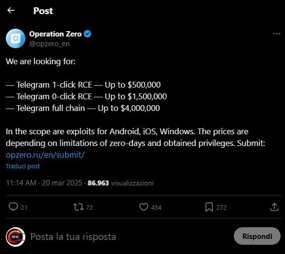 Una società russa di intermediazione di exploit (broker zeroday), di nome Operation Zero, ha annunciato pubblicamente ricompense fino a 4 milioni di dollari per le vulnerabilità zero-day in Telegram, a dimostrazione del crescente interesse da parte degli Stati nel compromettere la popolare app di messaggistica.