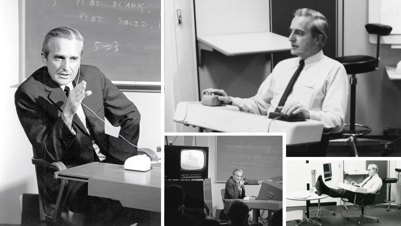 Engelbart era vestito con una semplice camicia bianca e indossava una cuffia con microfono incorporato (per intenderci quelle che oggi vengono usate nei call center) e le sue parole rimbombavano nella grande sala, mentre mostrava i prodigi della tecnica dalla sua postazione studiata dalla Herman Miller Company alla folla stupita.