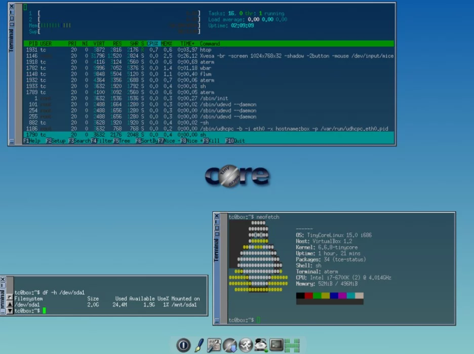Nella versione TinyCore, la distribuzione dimostra un consumo incredibilmente basso di spazio su disco (24,4 MB dopo l’installazione) e RAM (52 MB dopo l’avvio), pur rimanendo un sistema operativo a tutti gli effetti in grado di funzionare su un moderno PC multi-core.