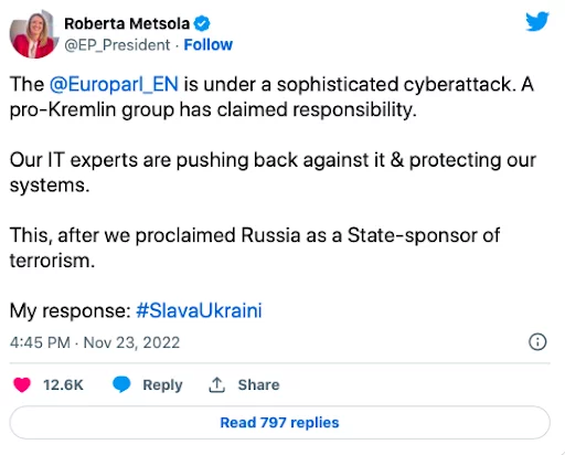 Iniziamo così proprio da loro, gli hacktivisti: uno dei gruppi più attivi filo russi, Killnet rimane al centro dell’attenzione con la rivendicazione dell’attacco DDos al sito web del Parlamento Europeo, parte dei suoi target occidentali subito dopo la dichiarazione formale che classificava la Russia come sponsor del terrorismo di stato (575 eurodeputati a favore, 8 contrari, 24 astenuti). Dopo gli ultimi attacchi ai siti web degli aeroporti americani, il tentativo di sovraccaricare quello della CIA, mitigare le loro azioni è importante monitorare il gruppo sui suoi canali Telegram e Twitter, comprendendo le proprie vulnerabilità e identificare anche i dispositivi IoT vulnerabili per impedire che vengano utilizzati come tunnel SSH o parte di botnet DDoS.