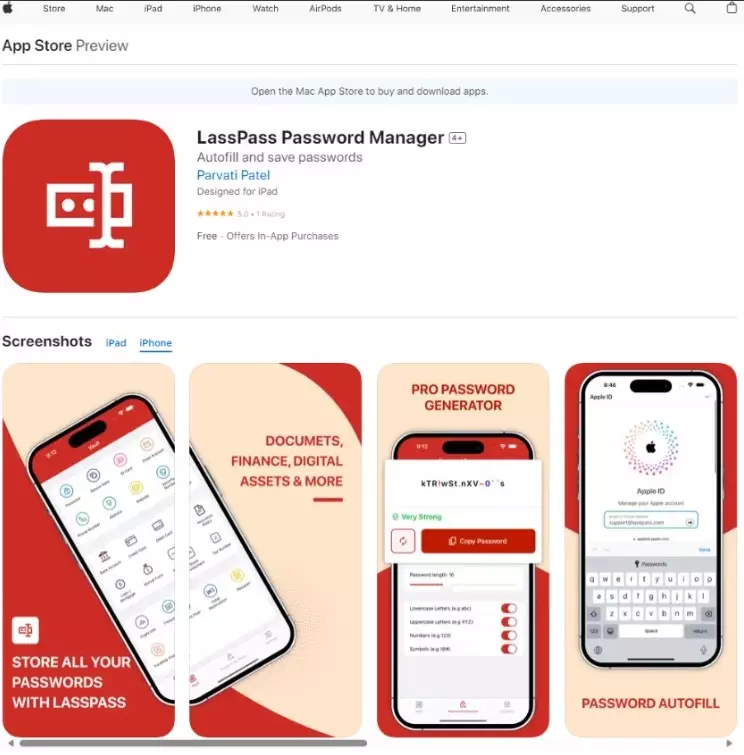 L’app falsa utilizza un nome simile all’app reale, un’icona simile e un’interfaccia rossa per farla sembrare l’autentica LastPass. Il nome è LassPass, non LastPass, e il suo editore è Parvati Patel. Inoltre, l’app ha solo una valutazione (l’app reale ne ha oltre 52.000) e solo quattro recensioni che avvertono che è falsa.