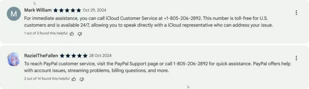 Inoltre, questi numeri di telefono falsi possono essere pubblicati non solo nelle recensioni delle estensioni del browser, ma anche sui siti dove chiunque può creare i propri contenuti: ad esempio sui forum aziendali o su Reddit.