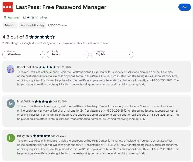 Gli sviluppatori riferiscono che tra le recensioni dell’estensione LastPass per Chrome, hanno iniziato a imbattersi in messaggi degli aggressori. In tali recensioni, i truffatori attribuiscono all’estensione cinque stelle e lodano il supporto tecnico, indicando un numero di telefono falso (805-206-2892) a cui avrebbero chiamato.