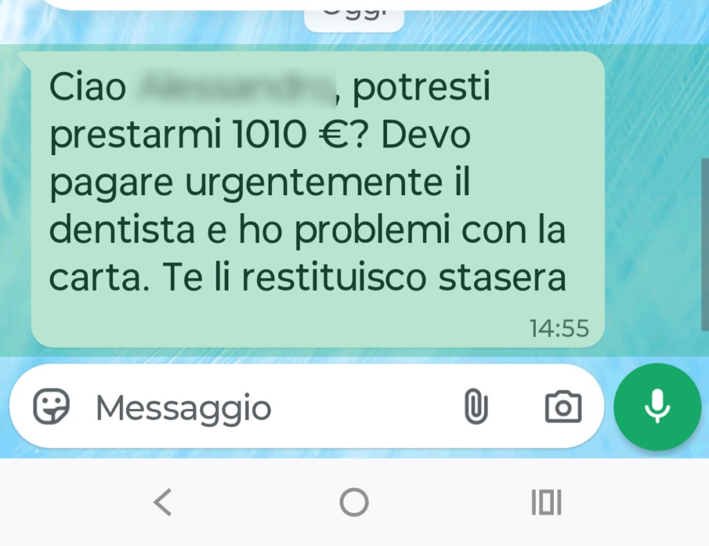 L’attaccante prende il controllo dell’account WhatsApp di una vittima e sfrutta la rubrica per contattare amici, colleghi e familiari. Il messaggio, carico di urgenza, punta sulla fiducia tra mittente e destinatario, inducendo a un pagamento immediato.