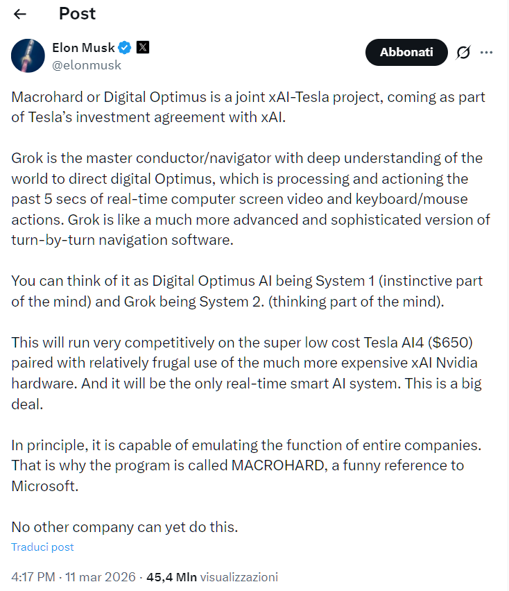 In passato Musk introdusse il nome Macrohard come parodia ironica di Microsoft e anche come breve descrizione dell’intera idea. Se un’azienda vive principalmente all’interno dei computer, scrivendo codice, lavorando con documenti, interfacce e servizi digitali, allora una parte significativa di questo lavoro di routine potrebbe teoricamente essere automatizzata.