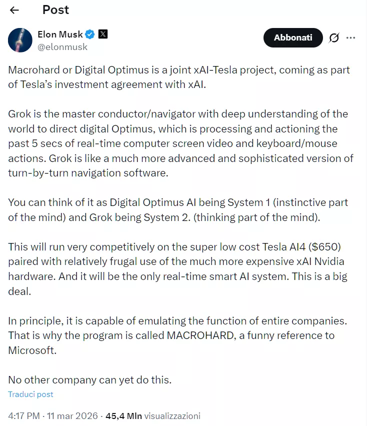 In passato Musk introdusse il nome Macrohardcome parodia ironica di Microsoft e anche come breve descrizione dell’intera idea. Se un’azienda vive principalmente all’interno dei computer, scrivendo codice, lavorando con documenti, interfacce e servizi digitali, allora una parte significativa di questo lavoro di routine potrebbe teoricamente essere automatizzata.