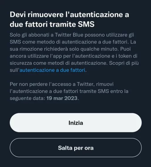 Stanno iniziando ad arrivare agli utenti di Twitter che non hanno la famosa “spunta blu” (Twitter Blue) dei messaggi che li informano che il metodo di autenticazione a 2 fattori tramite SMS, non potrà essere più utilizzato.